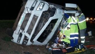 Um homem, que não teve seu nome divulgado, ficou preso às ferragens após tombar a carreta que conduzia, na noite desse domingo (1