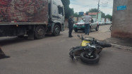 Um caminhão invadiu a preferencial e colidiu contra uma motocicleta onde pai e filho trafegavam, no cruzamento entre as Ruas Barrabás e