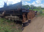 Um caminhão boiadeiro tombou na BR-174, na região de Mirassol D’Oeste (a 329 km de Cuiabá), nessa terça-feira (14).