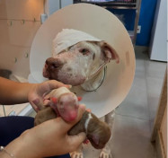 Branquinha, uma Pitbull de aproximadamente 7 anos, diagnosticada com leishmaniose e linfoma cutâneo – um tipo de câncer de pele, pre