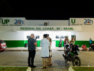 Em frente a uma UPA, prefeito Abílio Brunini, em visita feita durante à noite, conversa com pacientes e servidores