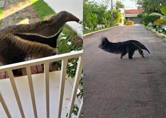 A moradora de um residencial de Cuiabá recebeu a visita ilustre de um tamanduá na frente de casa.