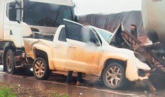 Uma mulher ficou ferida em um engavetamento envolvendo dois veículos de carga e uma caminhonete, na manhã desta quinta-feira (27), no km