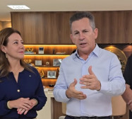 Flavia Moretti, Mauro Mendes e secretário Gilberto Figueiredo durante reunião no Paiaguás