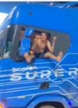 Vídeo – Motorista senta na janela de carreta em movimento