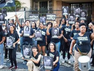 Jovens fazem protesto em frente a prédio de acusado por tortura e morte de Rubens Paiva