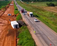 Um vagão de uma carreta carregada de carne tombou, neste domingo (20), após o condutor perder o controle da direç&