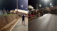 Um motorista de carreta que transportava soja perdeu o controle da direção e atravessou a via, parando o segundo vagão sobre a pi