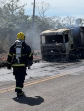 Um caminhão carregado de areia ficou completamente destruído ao ser atingido pelo fogo, durante a manhã desta quinta-feira (5), n