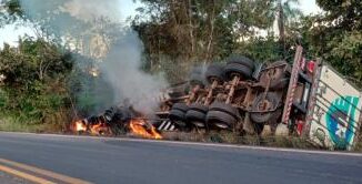 Caminhoneiro, que não teve a identidade revelada, ficou ferido ao perder o controle do veículo, que tombou e pegou fogo na Serra do Cach