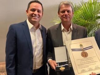 O governador de São Paulo, Tarcísio de Freitas (Republicanos), recebeu do deputado estadual, Diego Guimarães (Republicanos)