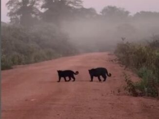 Uma cena fofa e rara foi registrada em uma estrada rural de Confresa. Duas onças-pretas, mãe e filhote, tranquilamente atravessam a via,