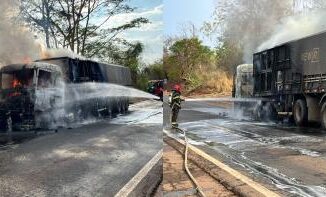 Carreta pega fogo após colisão com caminhão na BR-364 e bloqueia trânsito por horas