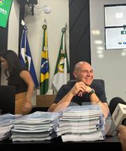 O prefeito Abilio Brunini (PL) chegou na Câmara de Cuiabá, na tarde desta quarta-feira (24), com várias apostilas que, segundo ele