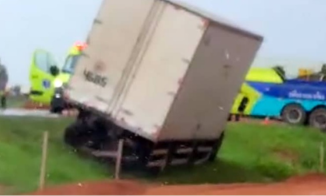 Um acidente envolvendo 3 veículos de carga deixou um ferido no início da tarde desta terça-feira (11) no km 649 da BR-163, em Luc