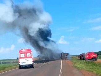 Uma carreta carregada de malha asfáltica tombou e pegou fogo na tarde da última segunda-feira (10) próximo ao Distrito Progresso,