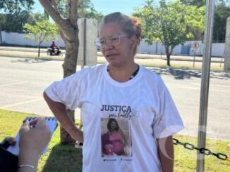 A técnica de enfermagem Ana Paula Azevedo, 44, pede por justiça. Ela está na porta do Fórum de Cuiabá, na manh&atil