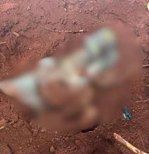 Um corpo decapitado e em alto estágio de decomposição foi encontrado enterrado em uma cova rasa, na manhã desta terç