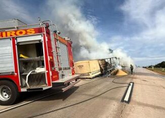Um caminhoneiro perdeu o controle da direção, o veículo tombou e pegou fogo na manhã desta terça-feira (20), no km
