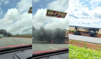 O segundo vagão de uma Scânia R 5640 pegou fogo, nessa quarta-feira (14), em um acostamento próximo ao km 626, da rodovia BR-163,