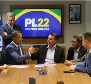 Coronel Assis cumprimenta Flávio Bolsonaro durante ato de filiação em Brasilia. Ananias Filho acompanha