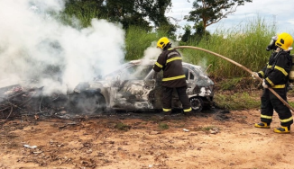 Um Gol branco foi incendiado nessa terça-feira (17), às margens da rodovia MT-560, nas proximidades do bairro Jardim Carolina, em